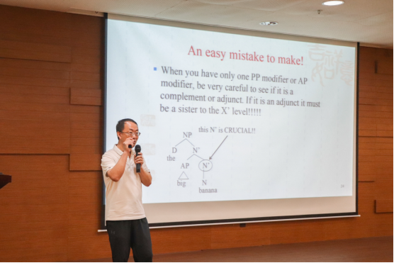 韩景泉教授用四组后置修饰语进行对比,然后找出其中有语法错误的一组,引出后续对词组的结构分析。随后讲述了传统的两层分析法和新的三层分析法的不同之处。接下来,韩教授讲到了讲座的重点,英语中并非只有词和词组,在三层分析法中,词与词组中间还有一个X-bar,这就是X-bar理论。教授用树形图分析了一些案例,还举了一些浅显易懂的例子帮助听众理解。