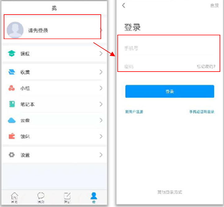 ② 之前已用手机号登录过或者新注册后没有出现绑定单位的界面打开学习通,点击“我”——“请先登录”——直接输入手机号与密码进行登录。
