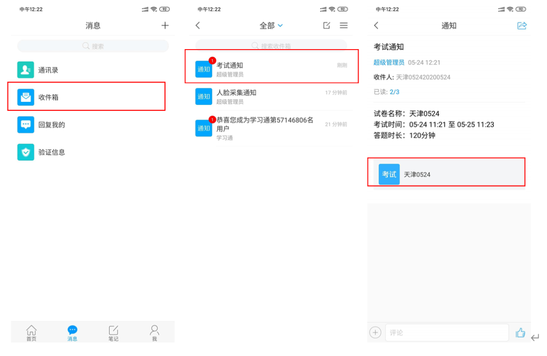 学校发起了考试通知,点击通知进入考试。