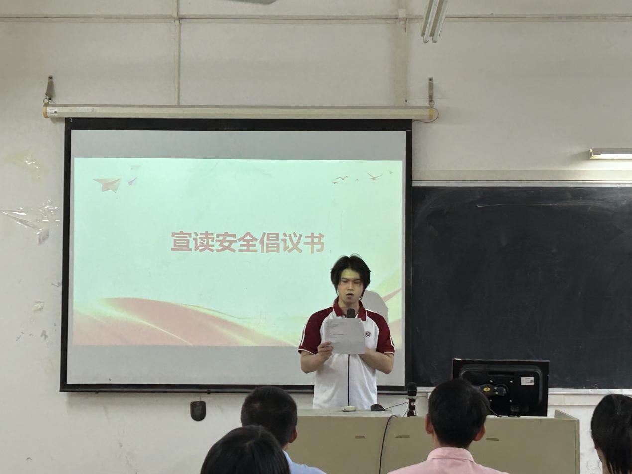 会议伊始,主持人宣读了安全倡议书。为保障同学们的安全,进一步做好学生安全教育工作,提出倡议:防范诈骗;遵守交通规则,保障交通安全;远离风险地带,保护人身安全;文明出行,维护公共秩序;留校自律,确保留校期间平安充实等。