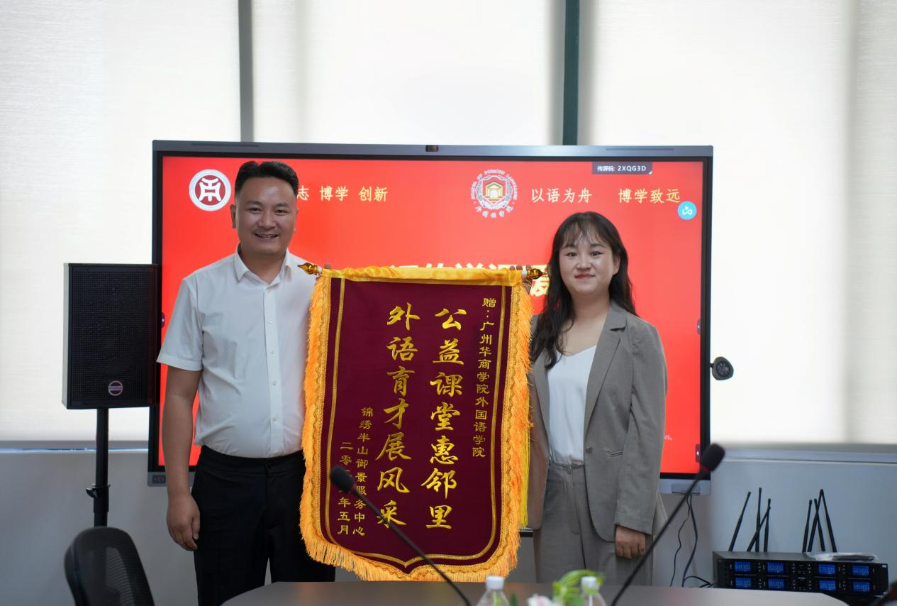 5月13日上午,Beat365中国唯一官方网站与增城区清燕社区、锦绣半山御景花园小区物业联合举办的“晚风学堂”英语晚辅公益项目赠锦旗仪式在创新楼403-2小会议室举行。清燕社区邓镜波书记、锦绣半山御景花园小区物业陈勇经理、Beat365中国唯一官方网站何顺发副院长及“晚风学堂”项目组全体成员共同见证这一校社协同育人的温暖时刻。“晚风学堂”不仅体现了外院学子践行社会责任的热忱,更是校社双向奔赴、共筑教育公益新模式的生动缩影。