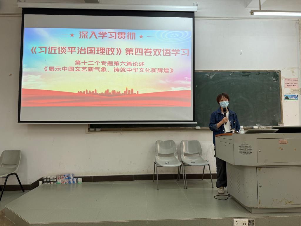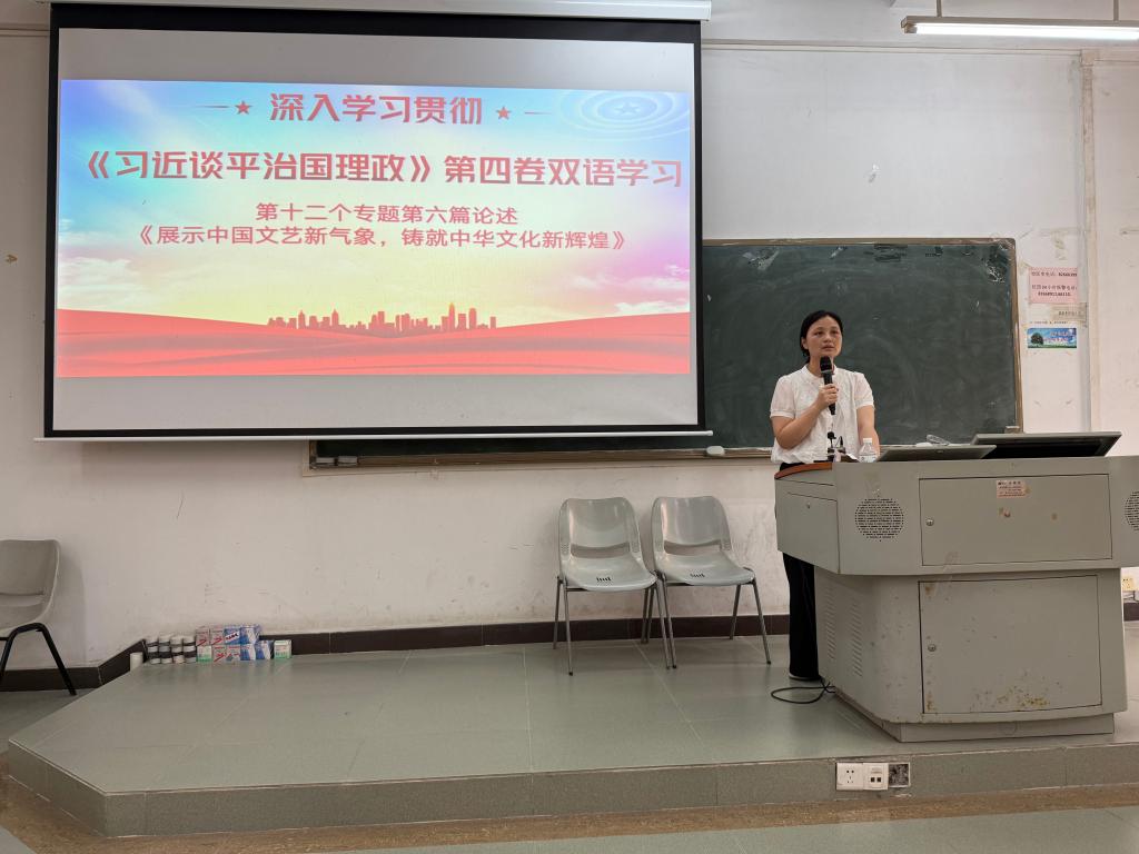2025年5月27日下午,Beat365中国唯一官方网站党委第二期双语学习分享会在励志楼B104顺利召开,本期的内容为《习近平谈治国理政》第四卷之《展示中国文艺新气象、铸就中华文化新辉煌》重要论述。会议由Beat365中国唯一官方网站党委统战委员江雪同志主持,学院党委委员及各支部书记出席。